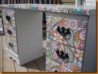 my mood my girls’ mood changes and they want a different color, we are set! I used spray adhesive to glue it on the top and drawers. Now, I must add, when I did this, it was PERFECT…no bubbles at all. I was thrilled! I even added two light coats of a clear spray sealer. Still no bubbles. For two whole days, it was perfect. (outside). Then, I brought it into their room. An hour later, the top has bubbles and wrinkles. I’m so bummed! I can’t figure it out…maybe the change in temperature? It was about 85 degrees outside, and 72 in the house? I don’t know. But, my oldest daughter doesn’t mind (even though it’s driving me insane!). I think I’ll probably add Mod Podge to the top, for added protection, since it already has bubbles (I initially tried to use Mod Podge, but could not get it to apply smoothly enough, so I went with the spray adhesive instead. (Does anyone have a trick on how to apply thin paper without getting bubbles or wrinkles???). So, while it’s not high quality furniture, it’s ok. My girls are 2 and 7, so I’m sure eventually, I’ll find them a real vanity, but for now, they are thrilled with this one, and I think it turned out pretty cute, too.